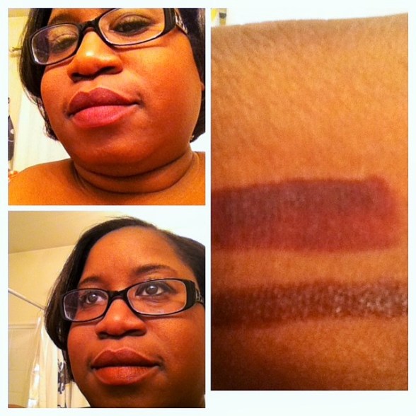 With the fall season finally here, I have purchased two fall lip colors. Normally in the fall, I have always stuck to reds, but I have been loving two new colors.  Mac’s Lingering Kiss (top photo) which is from their A Novel Romance collection and also a new find from Bite Beauty’s new Matte Creme lip crayon in Cognac(bottom photo). I have taken a picture with both colors on and swatched them next to each other.   Enjoy!
