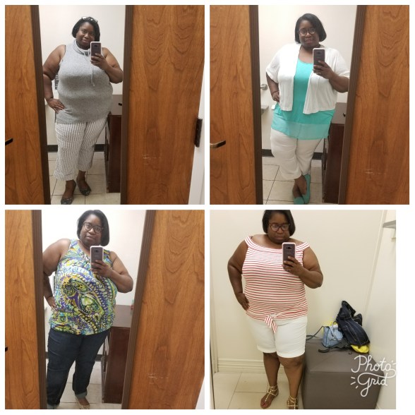 Bottom right: I was trying this on in the store (Lane Bryant), but I absolutely love it. The top also comes in blue and white. I purchased both since it was buy one, get one free. The Bermuda shorts were half off.